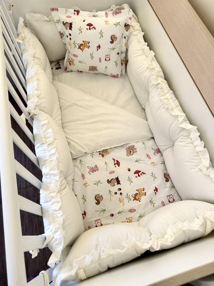 - Обиколниците се появиха с основната мисия да предпазват мъниците от твърдите решетки на кошарата. Нашите са плътни, пухкави и обхващат цялата кошара за максимален комфорт и безопасност. Пълнежа е силиконов пух, а от вътрешната стара има пришит допълнителен слой плат, за да сме сигурни, че няма да имате проблем при пране и продължително ползване.