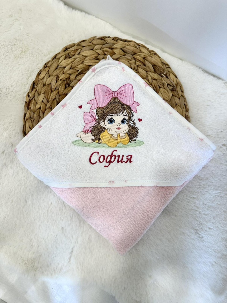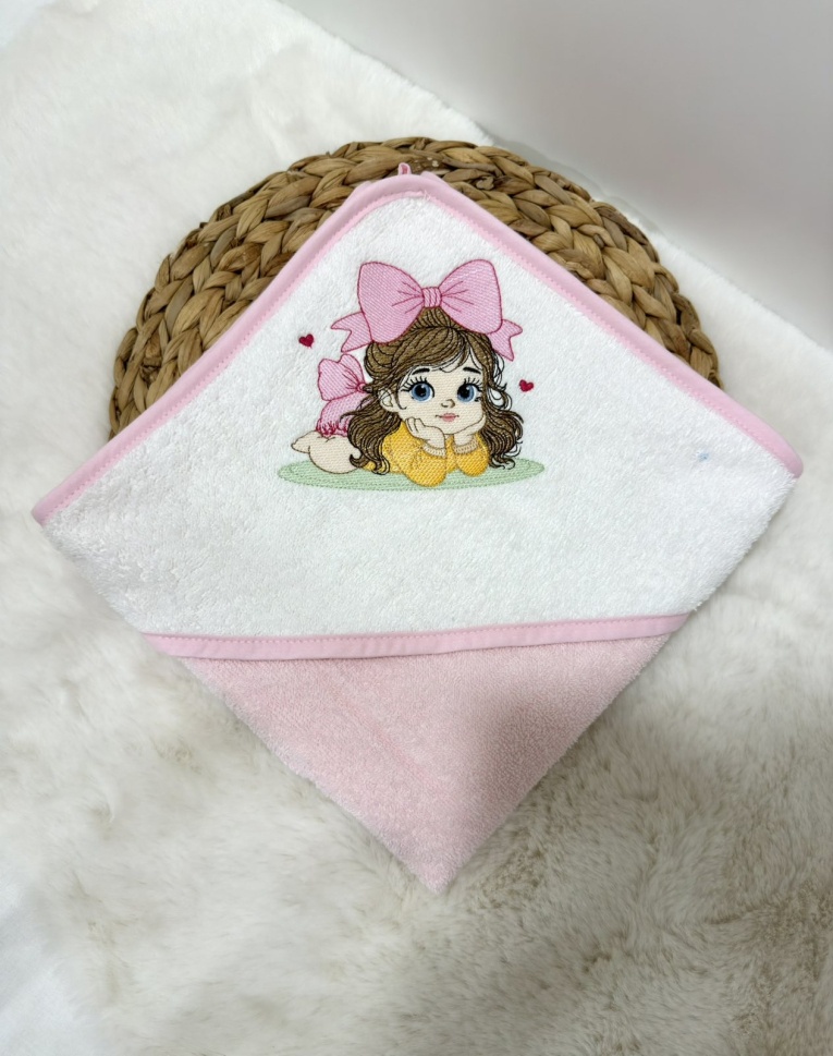 Бебешка бродирана хавлийка за баня "Момиченце с панделка" - розово
