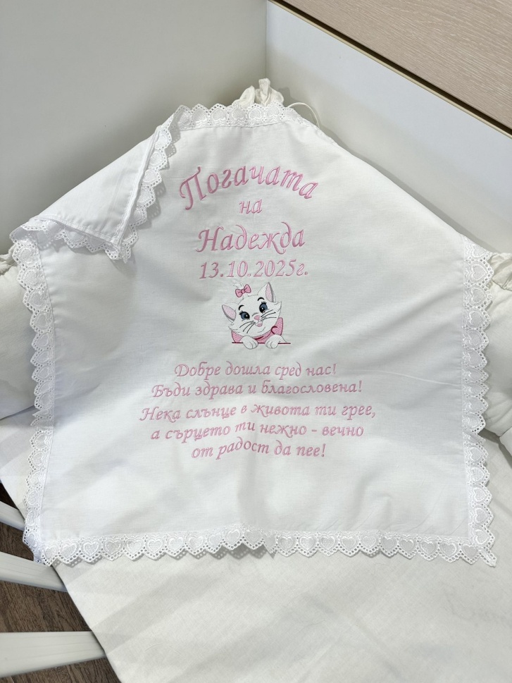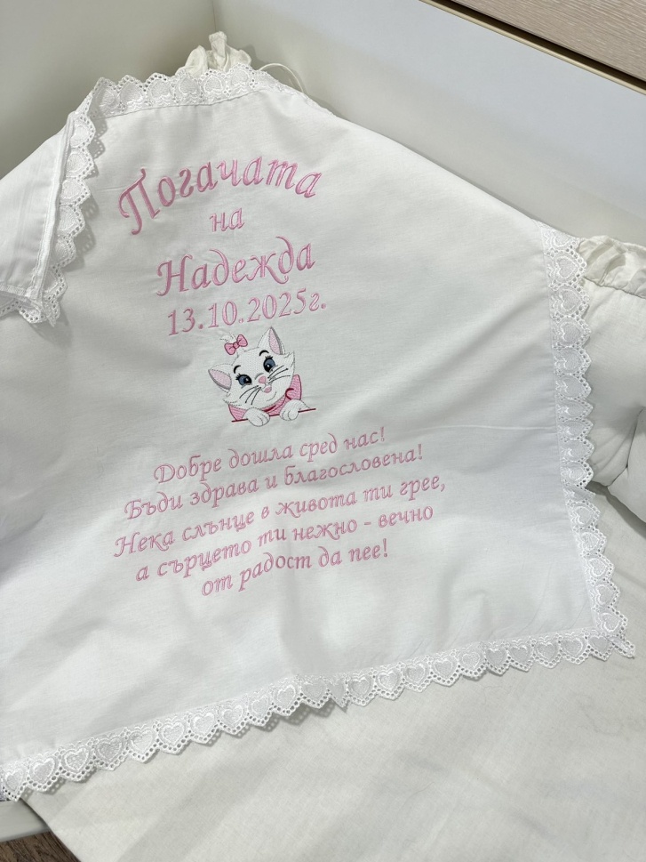 Бродирана кърпа/ месал за бебешка погача с текст - 60/60см. - "Коте"