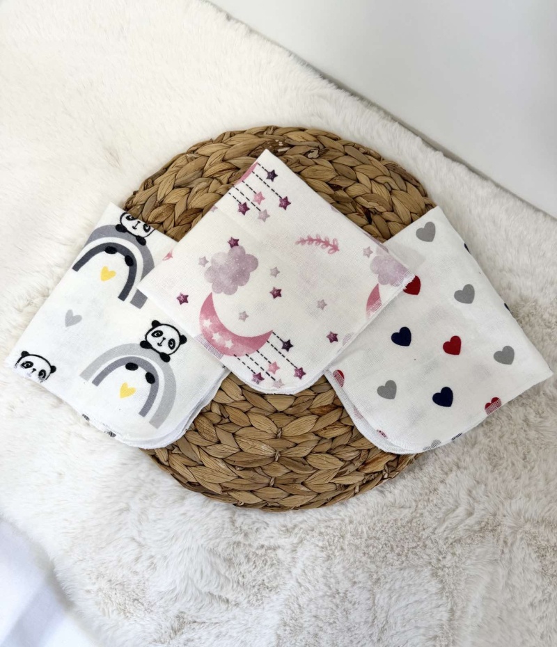 Комплект от 3 броя бархетни кърпички за многократна употреба "Пандички/луна/сърца"