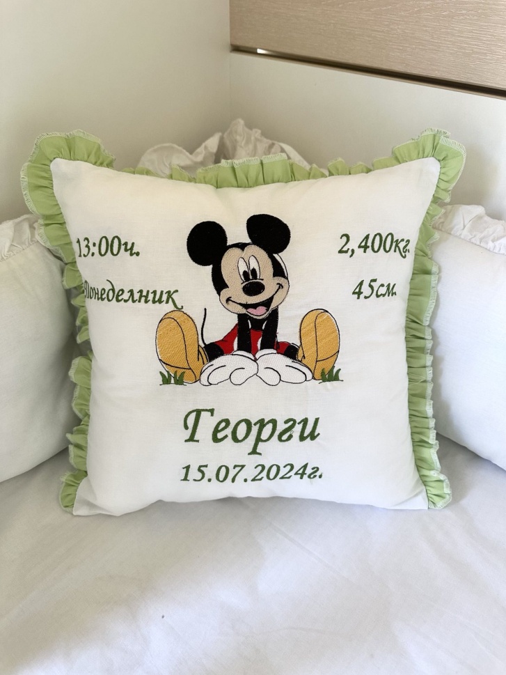 Бродирана персонализирана възглавничка за бебе "Мики Маус" - зелено - 40/40см.
