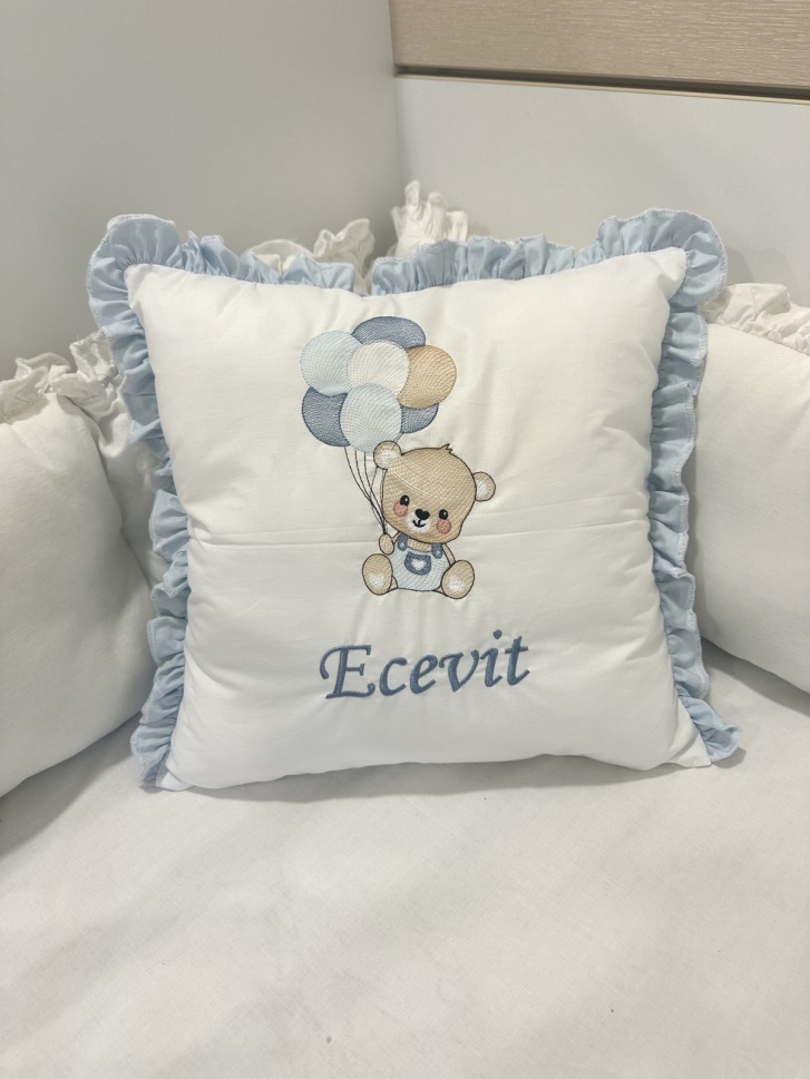 Бродирана персонализирана възглавничка за бебе "Мече с балони" - синьо - 40/40см.