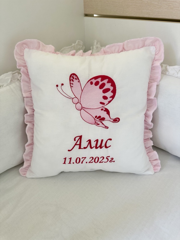 Бродирана персонализирана възглавничка за бебе "Пеперуда" - розово - 40/40см.