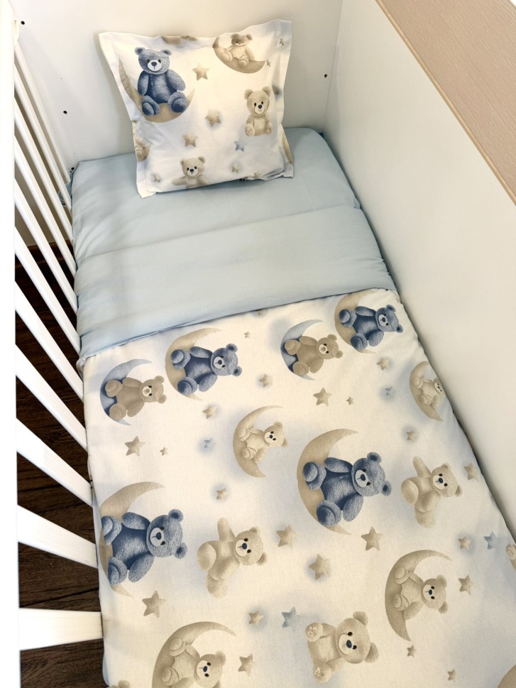 Изработен от висококачествен памучен плат - Ранфорс, щадящ и фин към нежната бебешка кожа.