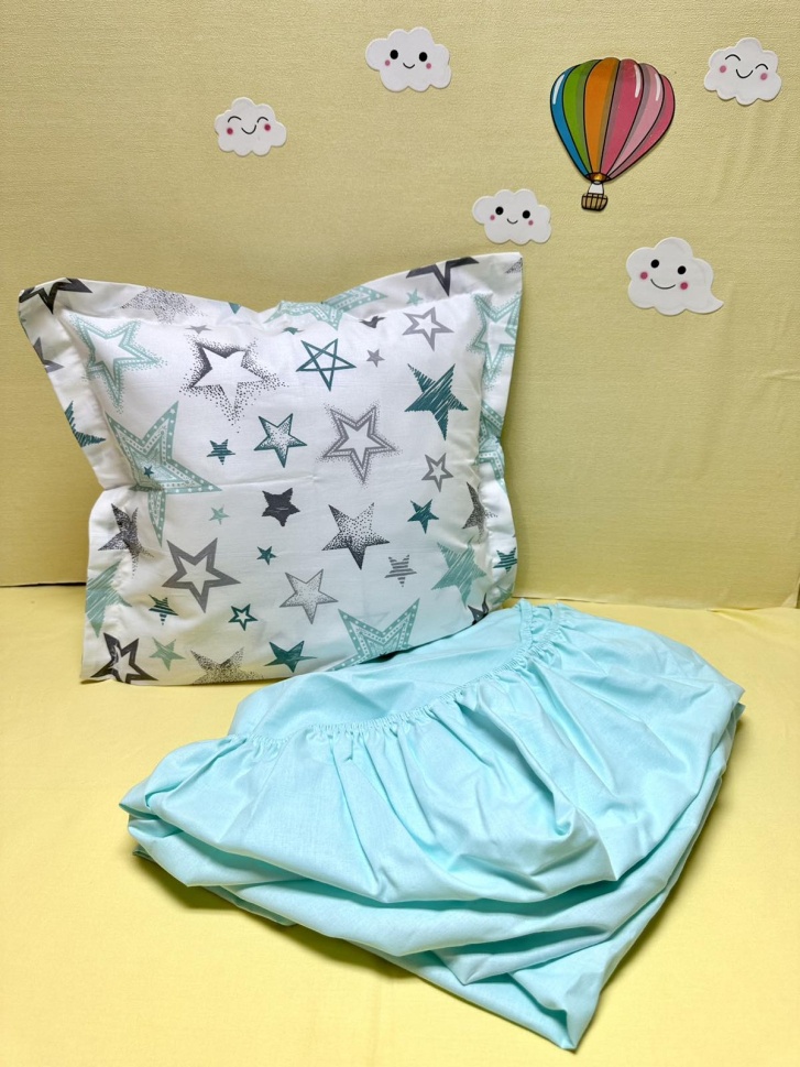 Долен чаршаф с ластик + калъфка - "Звездички" - мента