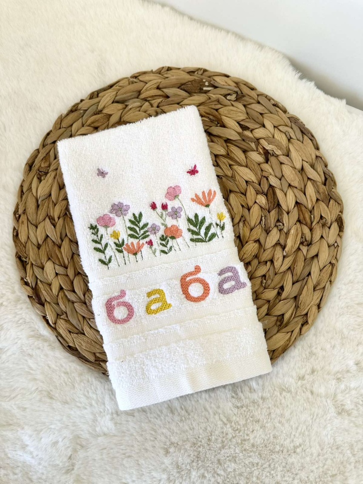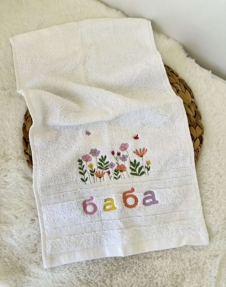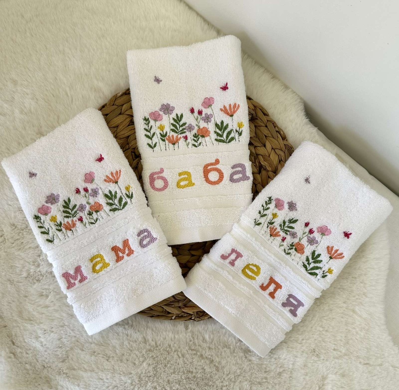 Нежен и стилен комплект хавлии с фина машинна бродерия на цветя и пеперуди, създаден с много внимание към детайла. Всяка хавлия е персонализирана с надпис, което я прави изключитело подходяща за подарък с лично послание и емоционална стойност.