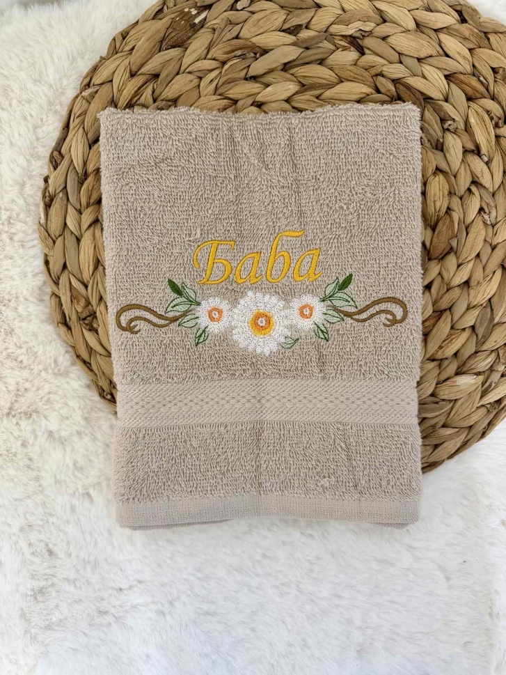 Нежен и стилен комплект хавлии с фина машинна бродерия на цветя и пеперуди, създаден с много внимание към детайла. Всяка хавлия е персонализирана с надпис, което я прави изключително подходяща за подарък с лично послание и емоционална стойност.