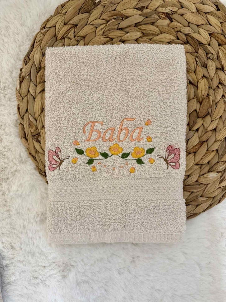Нежен и стилен комплект хавлии с фина машинна бродерия на цветя и пеперуди, създаден с много внимание към детайла. Всяка хавлия е персонализирана с надпис, което я прави изключително подходяща за подарък с лично послание и емоционална стойност.