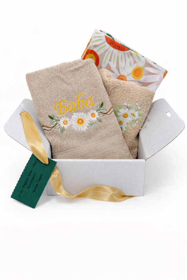 Подаръчният комплект съчетава практичност и елегантност, превръщайки се в чудесен избор за всеки специален повод. Комплектът съдържа хавлиена кърпа с размер 30 × 50 см, подходяща за лице или ръце, тюрбан за глава, който абсорбира бързо влагата след баня или душ, и тишлайфер, идеален за ежедневна употреба в кухнята.