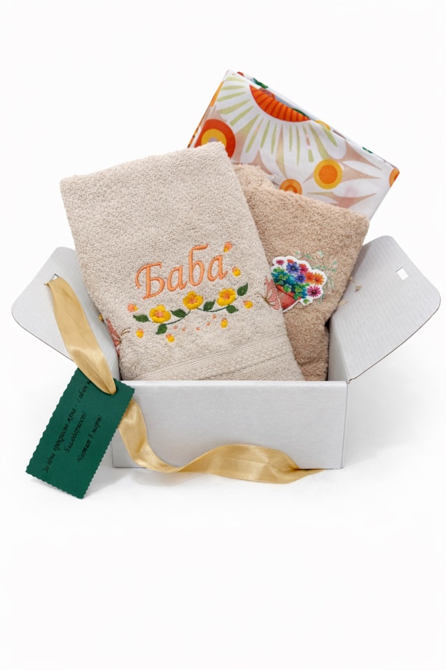 Подаръчният комплект съчетава практичност и елегантност, превръщайки се в чудесен избор за всеки специален повод. Комплектът съдържа хавлиена кърпа с размер 30 × 50 см, подходяща за лице или ръце, тюрбан за глава, който абсорбира бързо влагата след баня или душ, и тишлайфер, идеален за ежедневна употреба в кухнята.