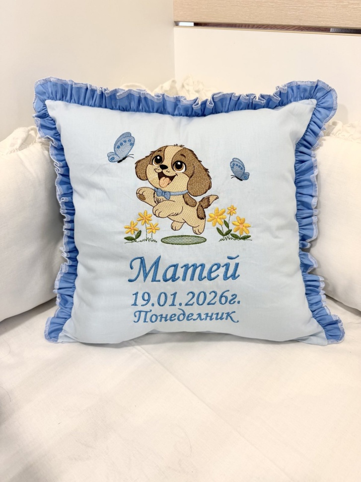 Бродирана персонализирана възглавничка за бебе "Кученце" - синьо - 40/40см.