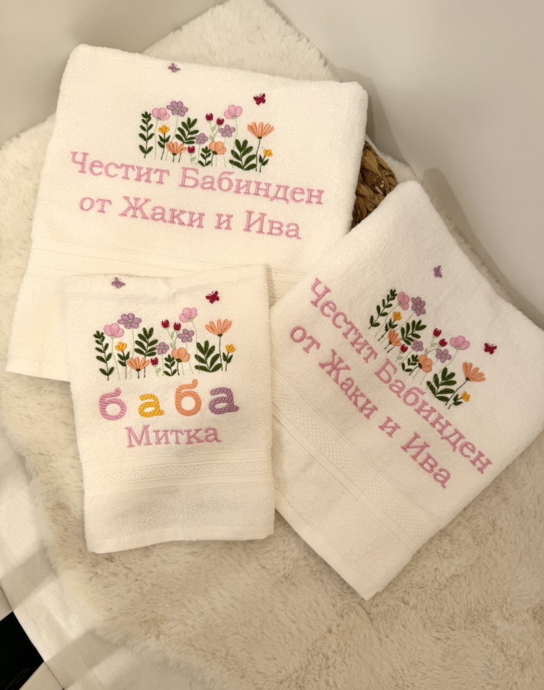 Хавлиен комплект „Празнична градина“ е създаден като нежен жест на внимание и благодарност. Флоралната бродерия в свежи цветове носи усещане за радост, празник и домашен уют, а персонализираният надпис прави комплекта истински личен подарък.