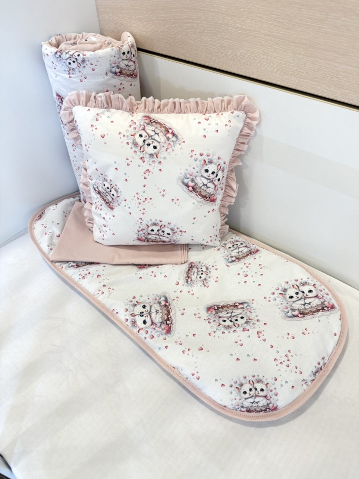 Бебешки комплект за количка + непромокаема подложка "Котешка прегръдка" - пудра