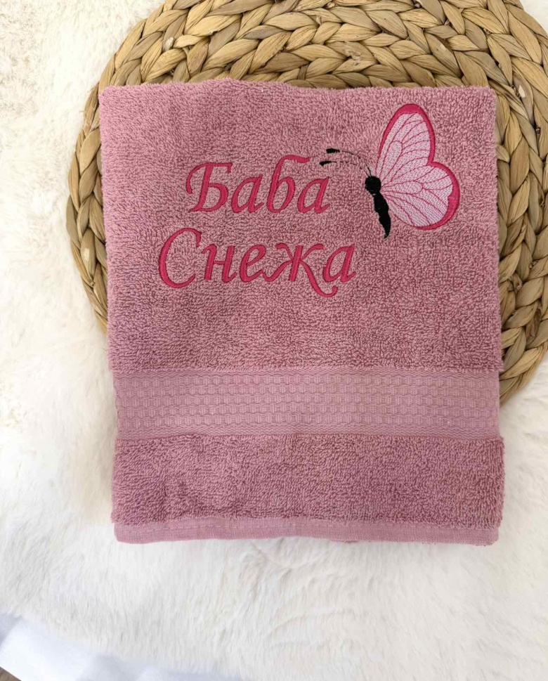 Нежен и стилен комплект хавлии с фина машинна бродерия на пеперуди, създаден с много внимание към детайла. Всяка хавлия е персонализирана с надпис, което я прави изключитело подходяща за подарък с лично послание и емоционална стойност.