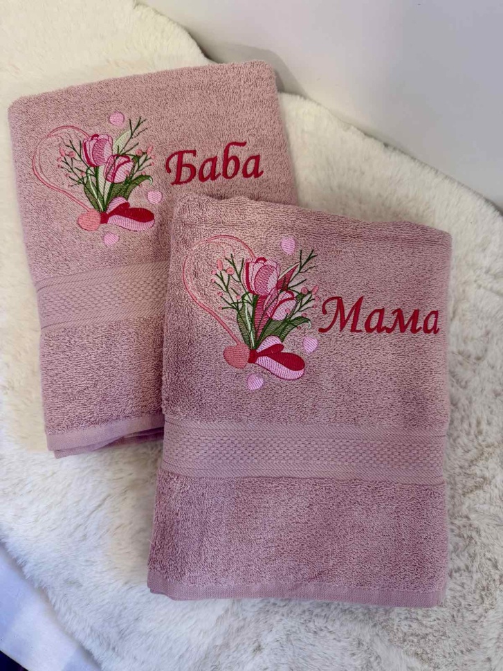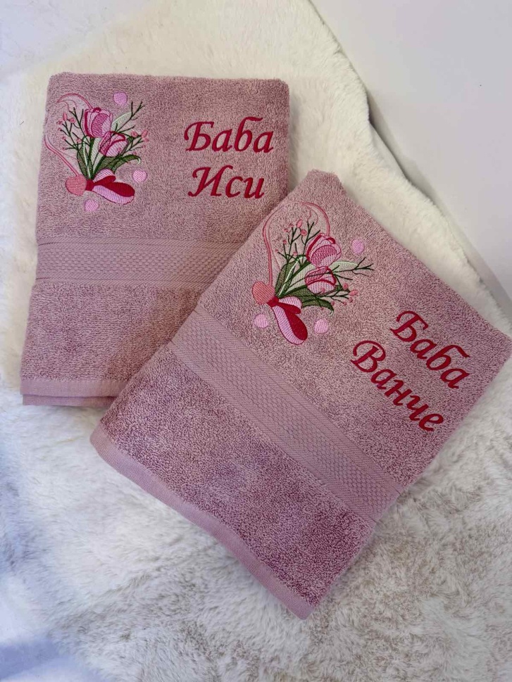 Нежен и стилен комплект хавлии с фина машинна бродерия с флорални мотиви, създаден с много внимание към детайла. Всяка хавлия е персонализирана с надпис, което я прави изключитело подходяща за подарък с лично послание и емоционална стойност.
