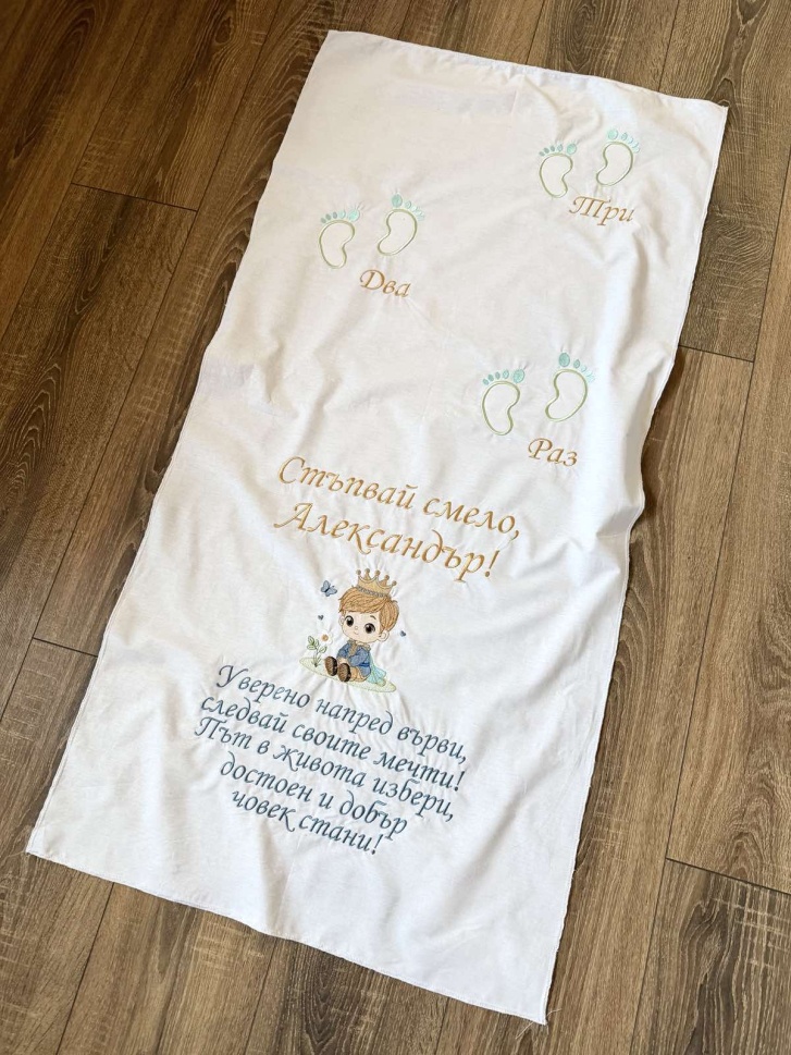 Празнично платно за прощъпулник с нежен и символичен дизайн. Украсено със стъпчици и надписите „Раз“, „Два“, „Три“, платното символизира първите крачки на детето. Персонализираното послание превръща платното в специален и емоционален акцент на ритуала.