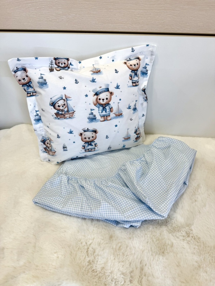 Долен чаршаф с ластик + калъфка - "Моряче" - синьо каре