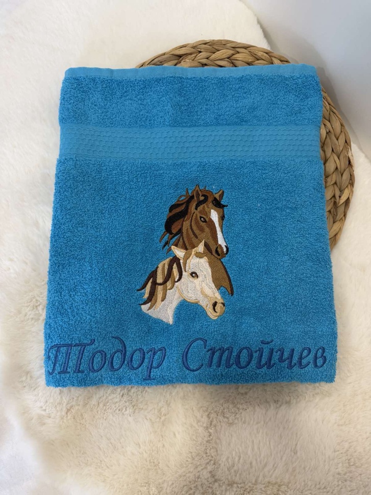 Начало ЗА ДОМА Персонализирана хавлия с бродерия "Коне" - син