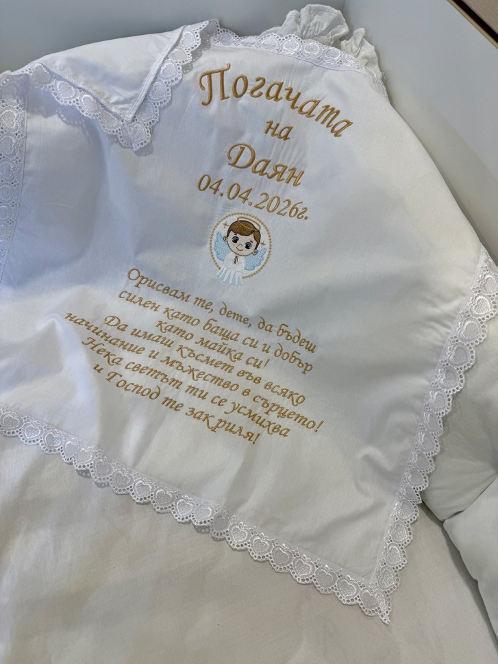 Красиво бродирано платно за завиване на погачата на 40-тия ден.