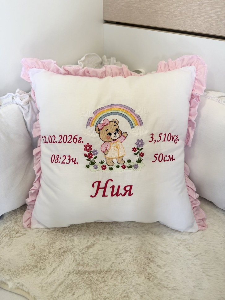 Бродирана персонализирана възглавничка за бебе "Меченце" - розово - 40/40см.